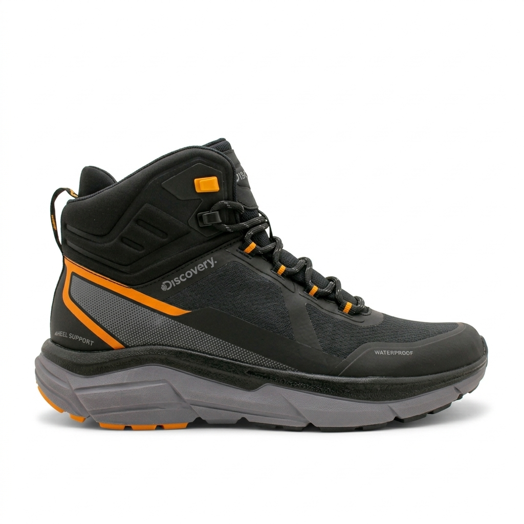 La bota Discovery OREGON-144NE en color negro está diseñada para el máximo rendimiento en terrenos exigentes, destacando por su construcción impermeable que protege eficazmente contra la humedad y el agua. Integra un sistema avanzado de soporte en el talón para brindar estabilidad estructural y reducir la fatiga en caminatas prolongadas,